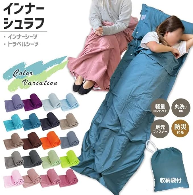 寝袋 インナーシュラフ 軽量 夏 薄手 インナーシーツ 封筒型 丸洗い可能 コンパクト 収納 シーツ 洗える 防災 緊急時 ボックスシーツ 防災 トラベルシーツ シュラフライナー 緊急時 防災グッズ キャンプ用品 車中泊 山小屋泊 収納袋付き