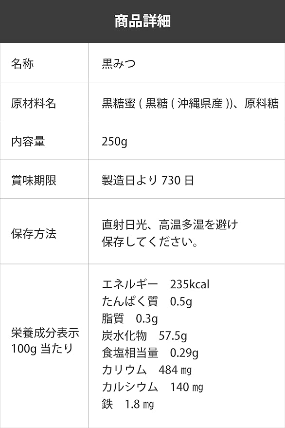 原材料:黒糖蜜(黒糖(沖縄県産))、原料糖
