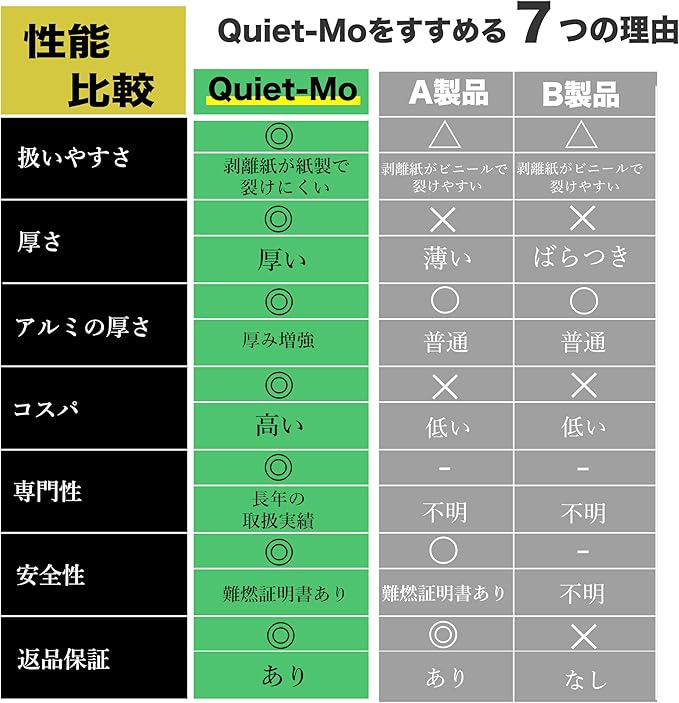 【品質管理】Quiet-Moは長年防音材専門のメーカーであり、徹底された品質管理を行います。当社の3重検品による厚み不良などの不良品の排除を行っており、安心してお買い求めいただけます。
