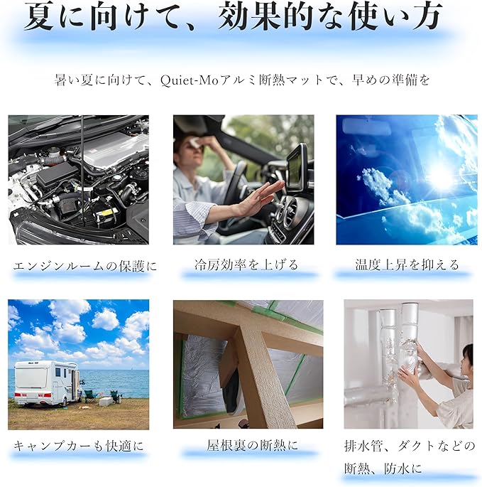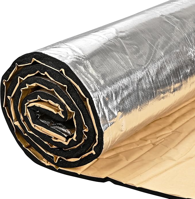 【商品規格】1mx2m 1枚。厚みは10mm以上で、施工時に内装に干渉しにくく、かつ防音断熱性能を強化した厚みとなります。使いやすいカット済み。ガラス繊維による編み込みのアルミ箔と防音ゴムフォームで構成された断熱材です。これ一枚で遮音性能、吸音性能、断熱性能、騒音減衰力、防腐性があります。特に車の内装に適し、真夏の暑い日差しによる車内温度の上昇を抑えたり、真冬の暖房効率のアップが期待できます。