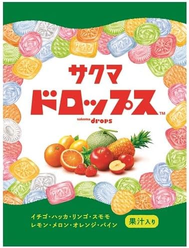 原材料:砂糖(国内製造)、水飴、濃縮果汁(いちご、パインアップル、オレンジ、レモン、りんご、メロン、すもも)/酸味料、香料、着色料(紫コーン色素、パプリカ色素、カロチン、紅麴、クチナシ、紅花黄)、(一部にオレンジ・りんごを含む)
