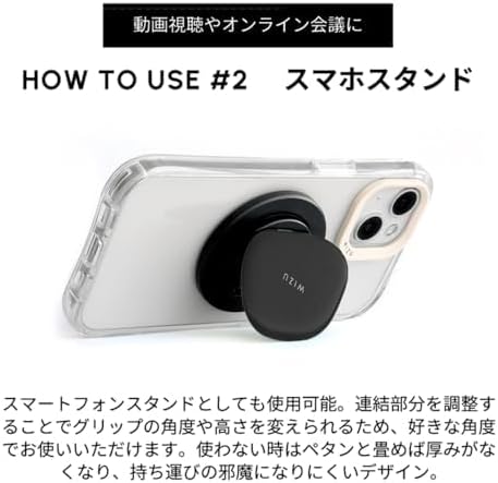 【動画視聴やオンライン会議に】スマートフォンスタンドとしても使用可能。連結部分を調整することでグリップの角度や高さを変えられるため、好きな角度でお使いいただけます。使わないときはペタンと畳めば厚みがなくなり、持ち運びの邪魔になりにくいデザイン。