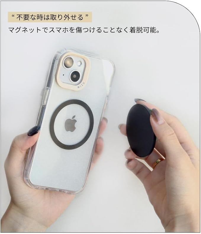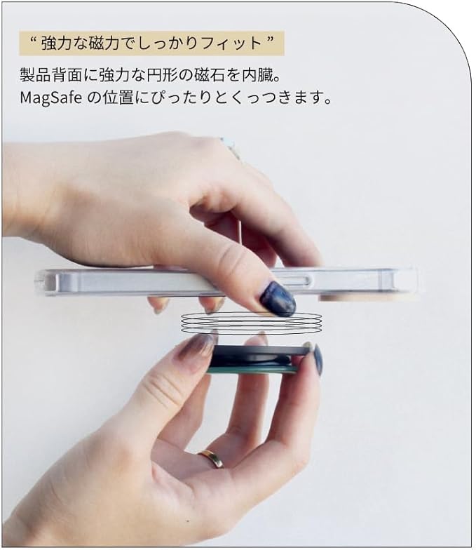 【マグネットで着脱可能】製品背面にマグネットを内蔵しており、付属のマグネットシールをスマホケースに貼るとMagSafe非対応でもマグネット着脱可能に!※MagSafe対応製品はシールなしでも使用できますが、貼ることで磁力が強化され、より安心してお使いいただけます。カメラフレームから5mm以上下の位置へ貼り付け推奨(写真撮影時の干渉防止のため)