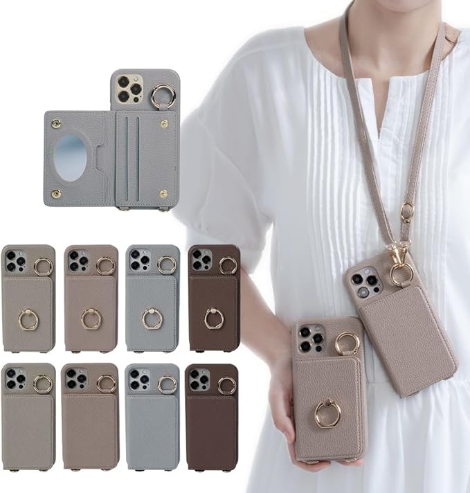 極薄 スマホケース ショルダー タイプ iphone15 pro max スマホ ショルダー 携帯ケース ストラップ付き 背面カード収納 リング付き マグネットなし背面手帳型 ケース レザー ショルダー ミラー付き