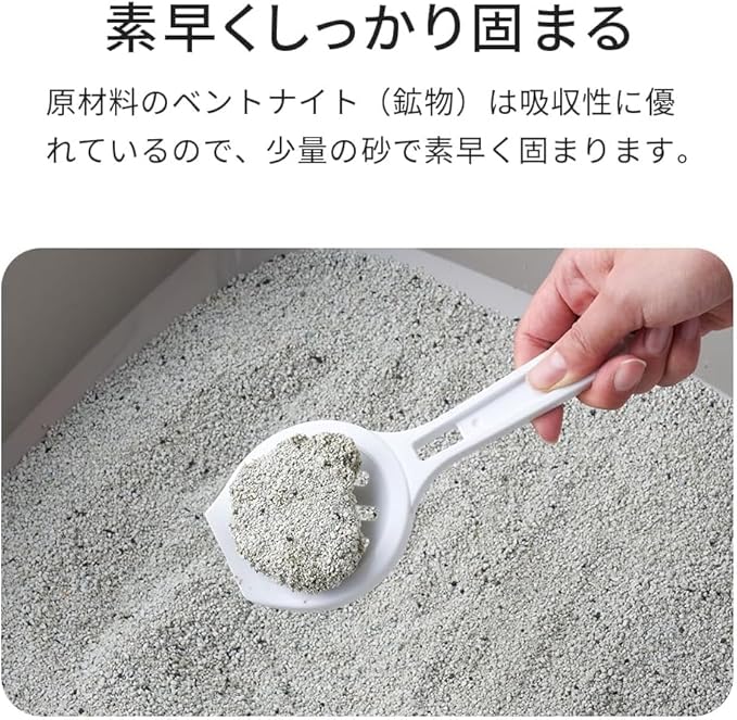 ✅シリカゲル・ゼオライト・活性炭という消臭力に優れた3つの素材をバランスよく配合することで、 気になるニオイを徹底的に排除します。原材料のベントナイト(鉱物)は吸水性に優れているので、少量の砂で素早く固まります、 また、凝固力が非常に高いので、固まりは崩れることなく簡単にすくえて快適です。