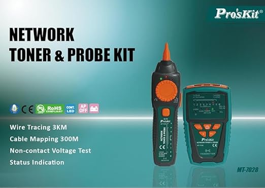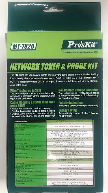 Pro'sKit tools solutions MT-7028 Network Toner & Probe Kit continuity, shorts, opens and crossover on RJ45 Lan cable Cat 5、5e、6、7 (UTP/STP)、RJ11/12 Telephone cable Cat. 3 (2/4/6 pin)(MT-7028)