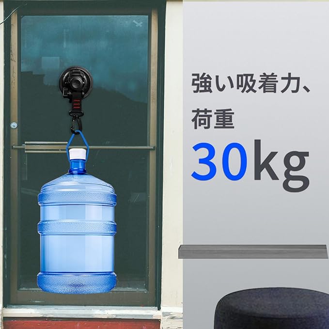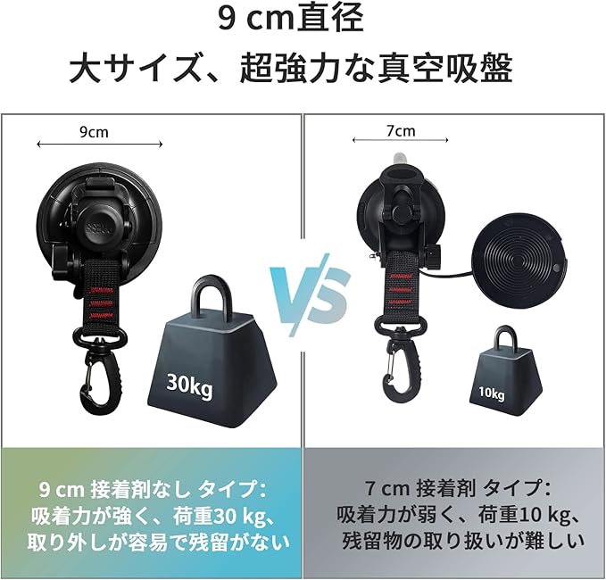 【大型直径9cm吸盤、耐荷重30kgの高い吸着力】高品質のABSとPVC素材で作られた吸盤は耐摩耗性、耐久性に優れています。直径9cmの大型吸盤を採用したことにより耐荷重も静的30kgを実現しており、家庭でもアウトドアでもストレスなく使用できます。長時間の使用でも吸着力が弱まらず、実用試験ではガラス扉に10kgの重りを24時間かけても吸盤が動かず安定して吊るすことを確認しました。そのため風の強い屋外でもサンシェードなどを車にしっかり固定することができます。