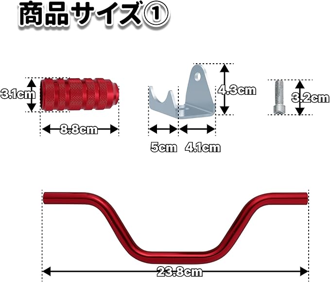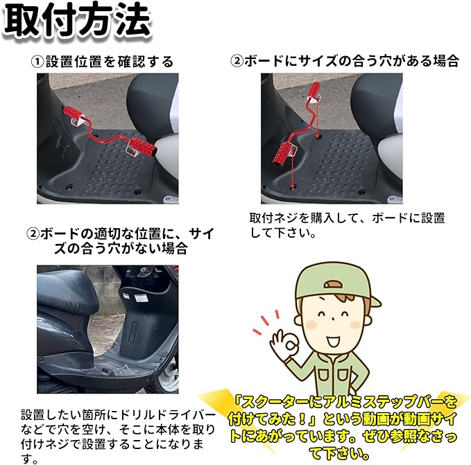 【適合車種など】 ズーマー、DIO、JOG、アクシス、V125、ZZなど多くのスクーターに取り付けできます。 ※ステップボードのネジ位置などのサイズが合えば比較的簡単に取り付け自体は可能ですが、足を置く位置を選んだりする場合には、DIYで電動スクリュードライバーなどでステップボードに穴を空け、取り付けることとなります。あらかじめサイズを確認して、スクーターに取り付ける場所・取付方法などをイメージなさって下さい。