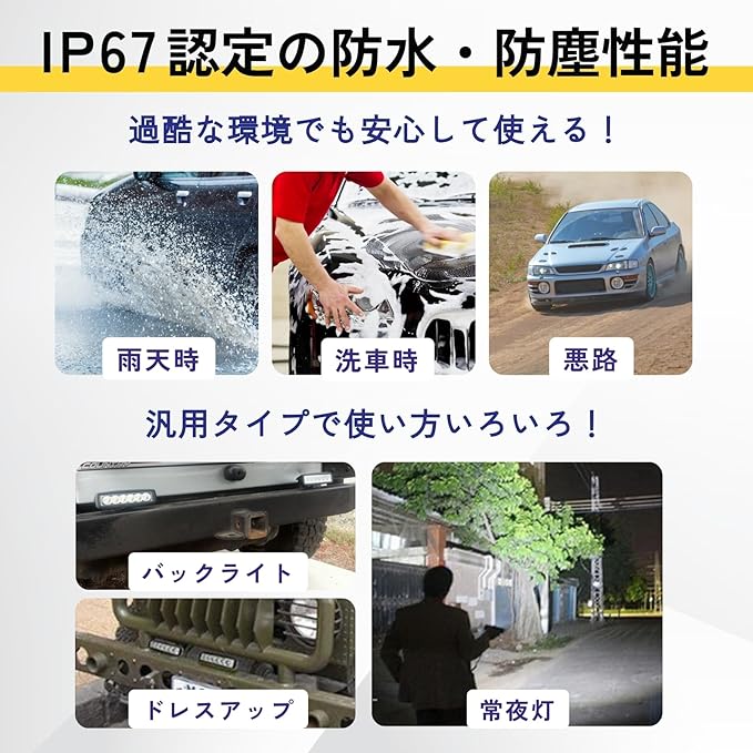 ・吊り下げて使うことができるLEDです。バックランプ、フォグランプ、ワークライト、作業灯として活躍します。また、IP67の防水防塵性能なので雨天時や洗車時、粉塵が舞う環境でも安心してお使いいただけます。
