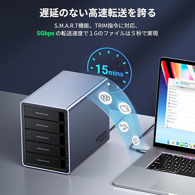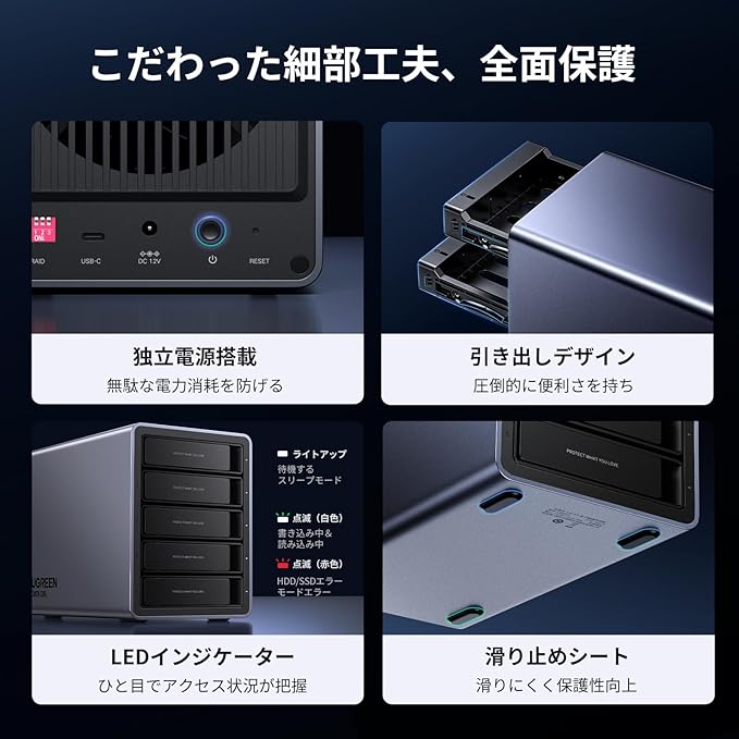 【RAID機能対応】 UGREEN HDD ケース 3.5インチ 5Bay SSD ケース USB 3.0 Type C接続 HDD ハードディスクケース 5台搭載可能 18TB 5台超大容量対応 UASP対応 5Gbps高速転送 独立電源スイッチ搭載 外付けハードドライブ アルミ製