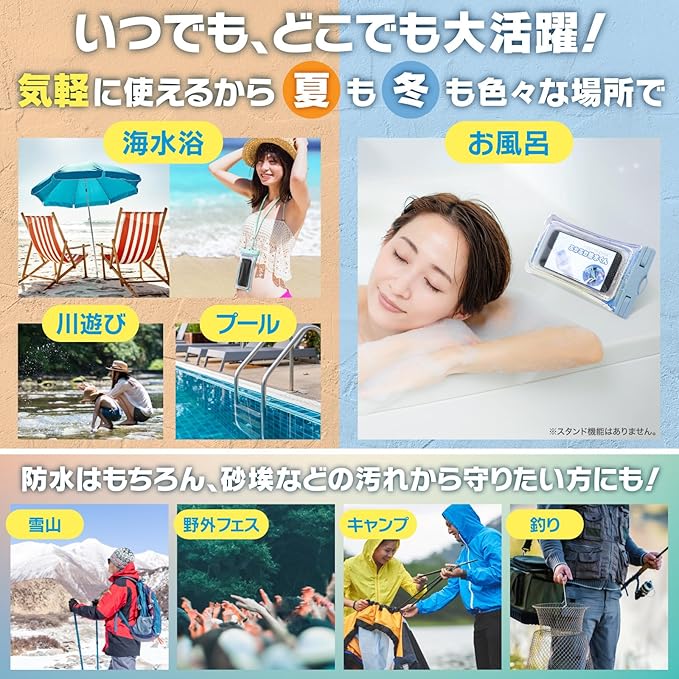▶▶▶【活用シーン】海水浴、プール、川遊び、雪山でのスノボーやスキー、お風呂、キャンプ、釣り、野外フェス、バイクでの配達など軽量で簡単に使えるので様々なシーンで仕様できます。【対応操作】音声通話、ビデオ通話、動画鑑賞、音楽鑑賞、写真撮影、動画撮影(すべて水中では使用できません)