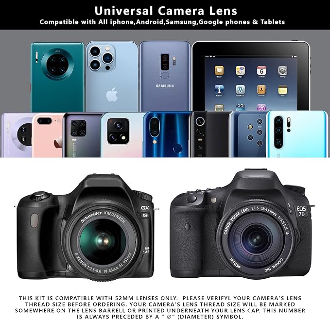 幅広い適用範囲:大口径のユニバーサルクリップは、スマートフォンやタブレットに取り付けることができます。 iPhone、iPad、Samsung、Google Pixel、Motorolaなどと互換性があります。 シングル、デュアル、トリプルカメラのセットアップを備えたスマートフォンで使用できます。 52mm NDフィルターは、「 52mm」スレッドでデジタル一眼レフレンズに固定することもできます。