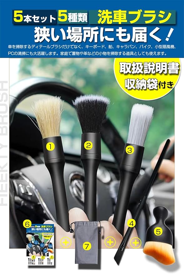 【自動車整備士推薦 5種類 5本セットの洗車ブラシ】:✅【ソフトブラシ】: 柔らかいブラシを使用すると、傷を効果的に防ぐことができます。✅【ミディアムブラシ】: 豚毛ブラシ。主に車のロゴ、車のグリル、ヘッドライトの隙間、車体の隙間などのやや硬い部分の清掃に使用されます。✅【ハードブラシ】: ハードの洗車ブラシで狭い隙間や強固な汚れに最適なブラシ。✅【マイクロブラシ】:車のエンブレム、レター、ヘッドライトの隙間、車体の隙間など汚れをピンポイントで除去できます。✅【ソフトブラシ車内用】主にエアコンの出口、ハンドルの隙間、シートの隙間、革の表面などに使用できます。