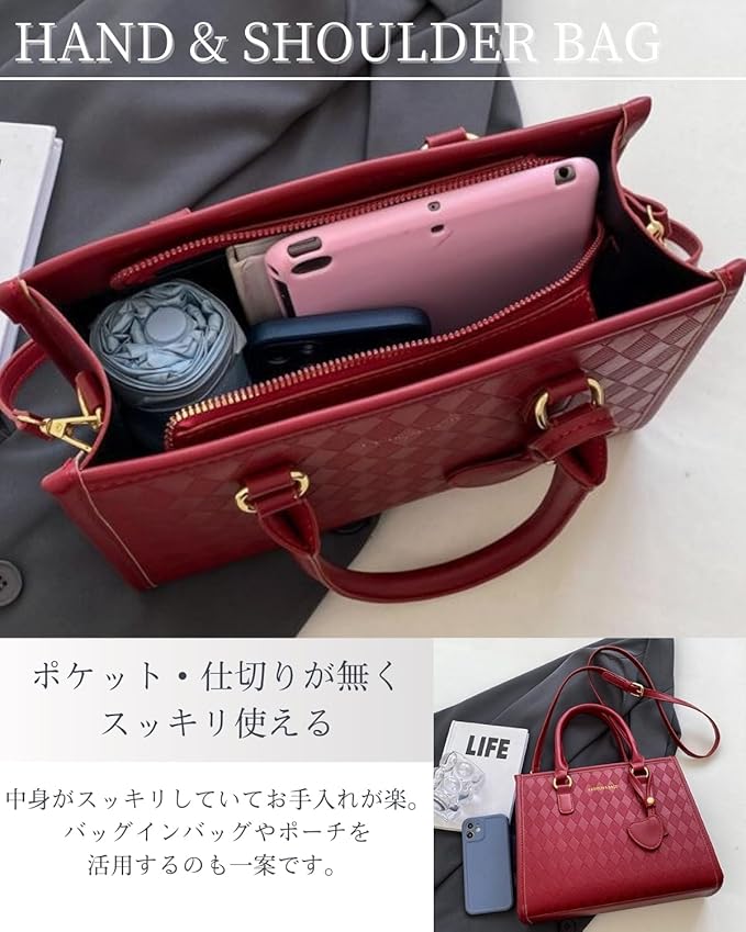 【ショルダーでもハンドでも選べる2WAY】機能的なショルダースタイル、上品な手持ちスタイル。シーンに合わせて楽しめる2way仕様です。カジュアルな普段使いはもちろん、きれいめコーデにもオススメです。