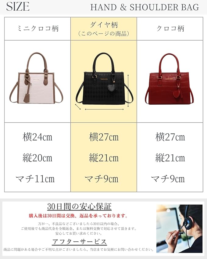 【カラバリは全5色】ブラック、ブラウン、レッド、ホワイト ブラック、ホワイト ブラウンの5色展開。それぞれ、型押しの柄がダイヤ柄とクロコ柄とあります。押し型の柄がコーデに華やかさを加えます。