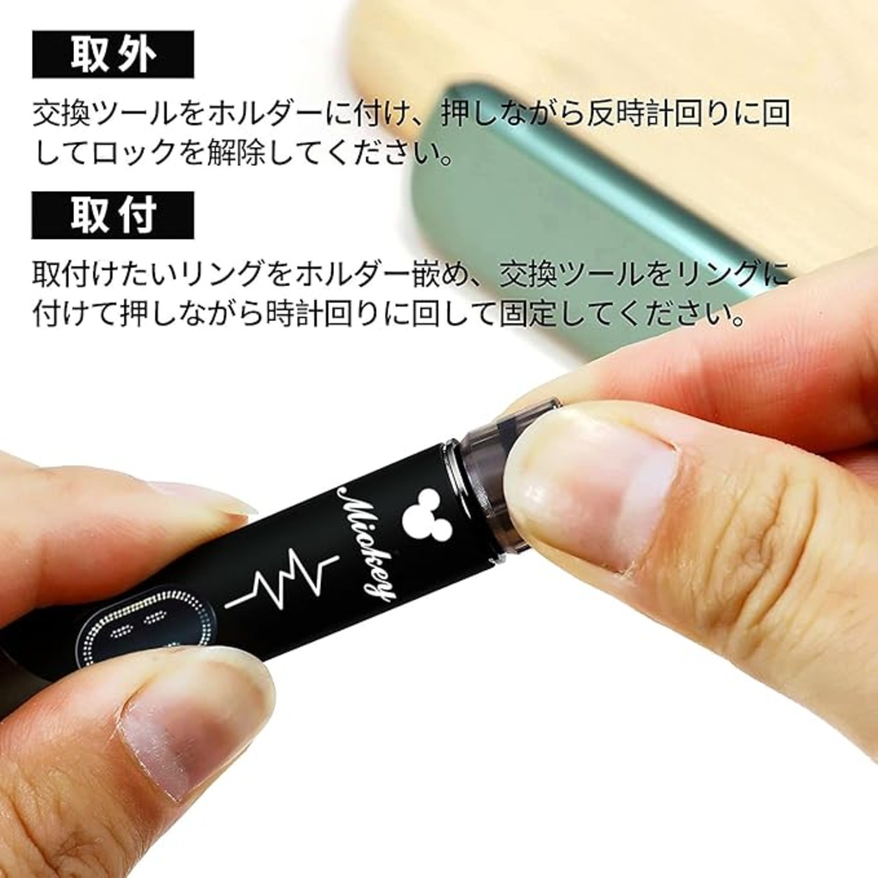 リング取り付け方法:同梱のリング取り外しツールをホルダーのリングにはめ、反時計回りに回してロックを解除します。新しいリングをホルダーに装着し、リング取り外しツールを使って時計回りに回して固定してください。