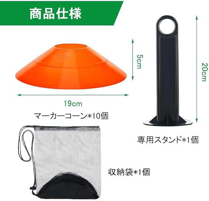★【商品仕様】サイズ:直径19cm 高さ5cm、マーカーコーン*10個 (赤、青、黄色、緑、オレンジ各2個)+収納袋*1個+専用スタンド*1個、数量:12個入り、重量:約262g。