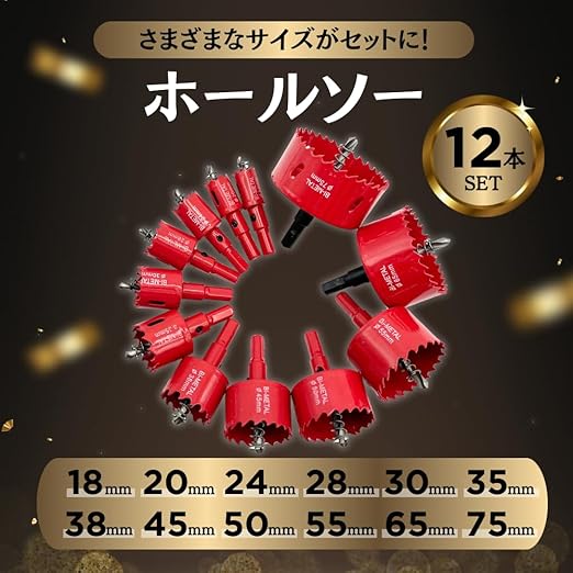 12本セット:18mm~75mmの直径のバイメタルホールソーが12本付属しています。
