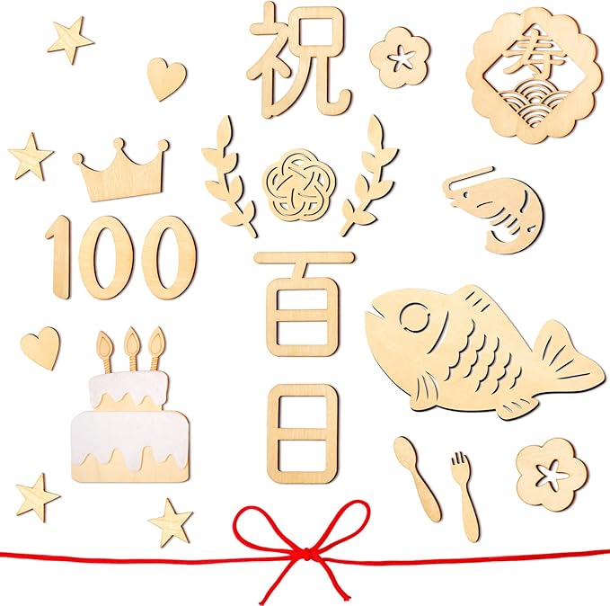【豊富な要素】:「祝、百、日」各1枚、「魚」*1枚、「梅結び」*1枚、「エビ」*1枚、「寿」*1枚、「ケーキ」*1枚、「1」*1枚、「0」*2枚、「フォーク」*1枚、「スプーン」*1枚、「クラウン」*1枚、「葉」*2枚、「花」*2枚、「星」*4枚、「ハート」*2枚、合計 2 4 枚。厚さ約3mm。また、縁起を象徴する長さ2メートルの赤い縄も付いています。