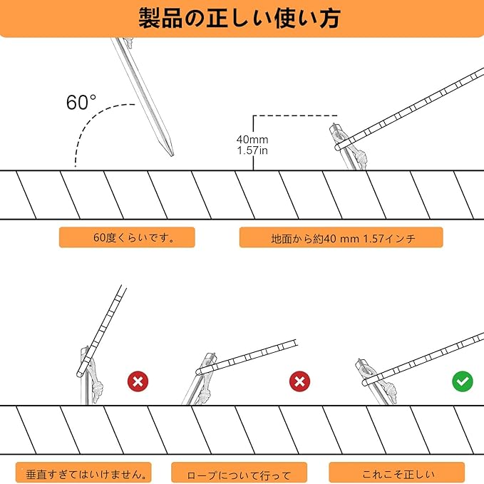 ✅【打ち込みやすい】 キャンプ ペグの先端は鋭角なので地面に差し込みやすい! また、円柱形のヘッド形状だからこそ。ハンマーで叩く際に滑りにくいので、打撃力を確実にポディに伝えます。土・砂浜・芝生など、地面に左右されず打ち込むことが可能に。