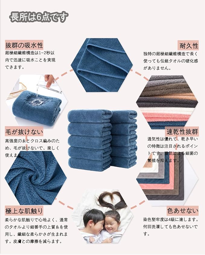 【抜群の吸水性と速乾性】綿の素材より吸水性が優れます。マイクロファイバー素材の表面は数えられない隙間があり、その隙間に大量の水分を素早い吸水できます。髪や肌にそっと当てるだけで水分が吸収される素材であり、また汚れも落としやすい特徴があります。隙間に取り込まれた空気が水分を拡散させるので、速乾性のポイントで、バスタオルの雑菌を抑え、健康を保つことができます。