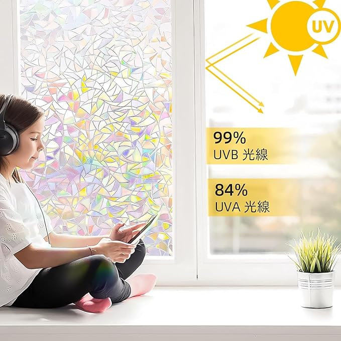 目隠し・UVカット機能:光が強ければ強いほどカラフルになり、可視光を反射して目隠しにもなります。紫外線UVA 84%・UVB99%以上をカットし、家具や床材の劣化、肌の損害を防ぎます。