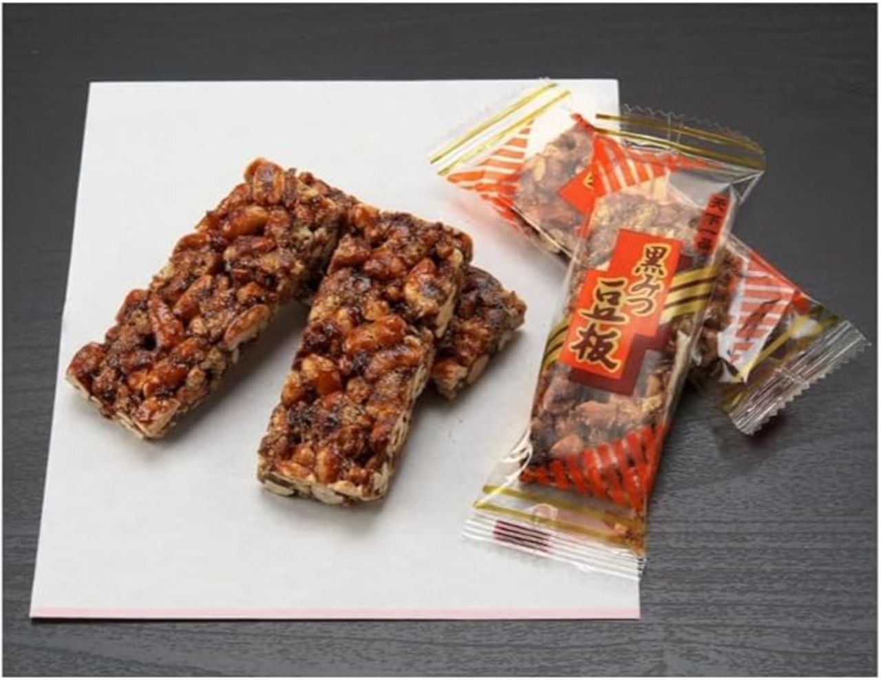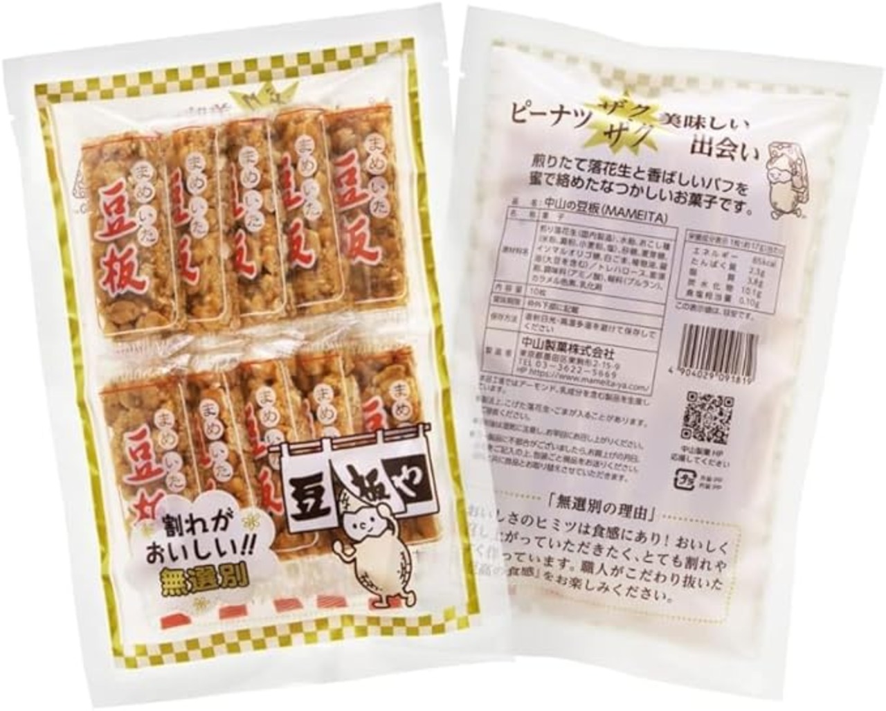 <中山の豆板(まめいた)>煎り落花生(国内製造)、水飴、おこし種(米粉、澱粉、小麦粉、塩)、砂糖、麦芽糖、イソマルオリゴ糖、白ゴマ、植物油、醤油(大豆を含む)/トレハロース、膨張剤、調味料(アミノ酸)、糊料(プルラン)、カラメル色素、乳化剤 <黒みつ豆板>煎り落花生(国内製造)、水飴、加工黒糖、おこし種(米粉、澱粉、小麦粉、塩)、砂糖、麦芽糖、植物油/カラメル色素、トレハロース、膨張剤、糊料(プルラン)、乳化剤(大豆由来)