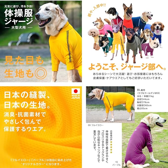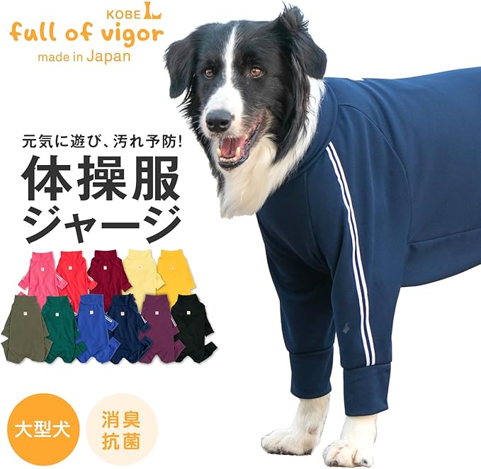 「大型犬用」体操服ジャージつなぎ 消臭・抗菌素材で優しく包み、保護します。 日本製の縫製と生地を使用し消臭・抗菌素材で優しく包み、保護するウエアです。 様々なシーンで大活躍!遊びや部屋着としても、皮膚保護・ケアウエアとしてもご使用いただけます。