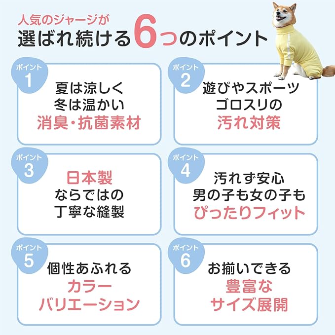 夏は涼しく、冬は暖かい、伸縮性に優れた消臭・抗菌素材を使用。 この素材は消臭・抗菌効果でニオイや菌の発生を抑え、吸湿速乾性、pHコントロール機能、静電気抑制、UVカット効果を兼ね備えたオールシーズン対応のハイブリッド素材です。 お腹周りはフィットするよう考慮されており、おしっこやうんちによる汚れも防ぎ快適です。 小型犬から大型犬まで、イタグレやフレブルなど、様々な犬種に対応する豊富なサイズ展開。