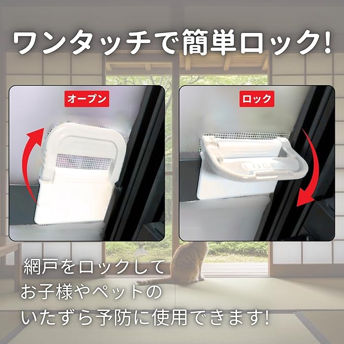ワンタッチで網戸を簡単ロック 粘着テープ式 網戸用ロック 2個入り 2セット 子供 転落防止 猫 脱走防止 取り付け簡単 工事不要 窓の防犯対策 窓補助錠 網戸ストッパー