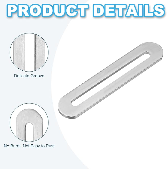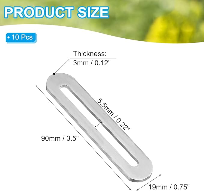カラー: つや消しシルバー。材質: ステンレススチール。全体のサイズ: 90 x 19 mm / 3 1/2 x 3/4 " (長さx幅)。厚さ: 3 mm / 3/25 "。スロット穴サイズ: 70 x 5.5 mm / 2 19/25 x 11/50 " (長さx幅)。梱包内容: ジョイント金具 10 個 (ネジは付属しません)。