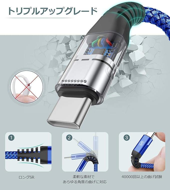 【高い耐久性】アルミニウム製ハウジングとナイロン製編組ジャケットにより、より強固なC型充電ケーブルを構築。特殊なストレインリリーフ設計により、40,000回の曲げテストに耐えることができます。柔軟な引っ張り強度を持ち、より柔らかく、より軽く、より耐久性があります。