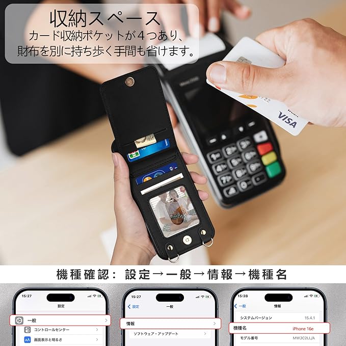 【対応機種】iPhone 16e 専用ケースです。縦置きスタンド機能とショルダーストラップ付きで、首掛けや肩掛けが可能です。背面にマグネット式カード収納ポケットを備えた便利な手帳型ケースです。購入前に対応機種と画面サイズをご確認ください。