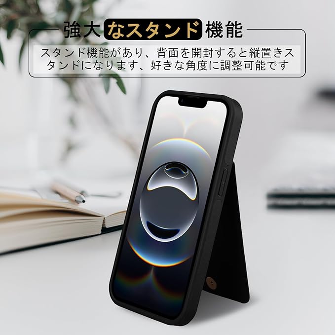 【多機能】❶ 収納機能:背面にカードポケットを4つ備え、カードや名刺、定期券などを収納可能です。マグネット式でしっかり閉まり、落下の心配がありません。❷ スタンド機能:滑らかでないテーブルの上に置けば、縦置きスタンドが可能で、映画や動画視聴が快適です。