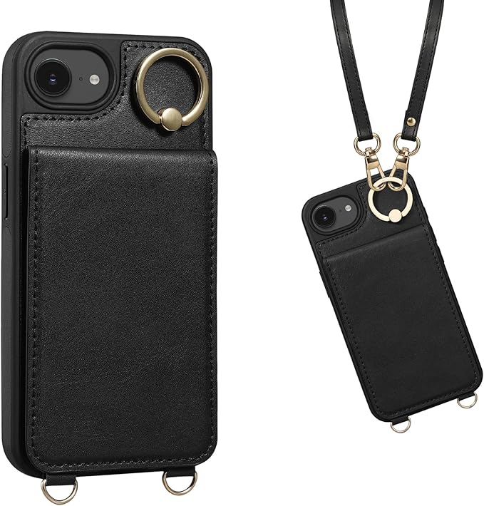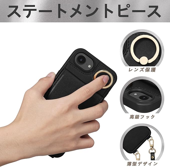 Shlybaay iPhone 16e 対応 ケース 背面 手帳型 カードケース ショルダー ストラップ いPhone 16e 用 手帳型ケース カード収納 PUレザー スタンド アイホン あいほん 16e 用 肩掛け 斜め掛け マグネット 6.1inch ブラック