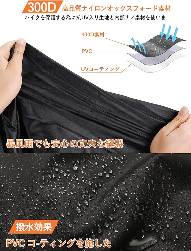 【420Dナイロンオックスフォード生地】 通常のバイク カバーのように厚すぎず、扱いやすい適度な重さを備えています。大型テントなどに使用される420Dナイロンオックスフォード生地を使用しており、通常のビニール素材を使った車体カバーよりも厚く、丈夫です。