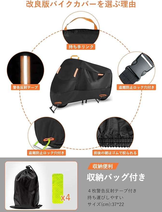 【反射ストリップ&収納バッグ付き】カバー取り付けにより、他のドライバーや歩行者が乗り物に気づき、交通事故や衝突リスクが低減します。乗り物が 夜間や暗所でも目立ち、盗難の標的にされにくくなります。 バイクカバーの反射ストリップに加え、お客様のために反射ステッカーを4枚追加しました。 夜間の無灯火車にも貼ることができる。「バイクにちょうどいい」厚さを追求し、高品質素材の収納バッグも付属しています。未使用時や持ち運びの際にはコンパクトに収納可能です。「サイズ:37*22cm」