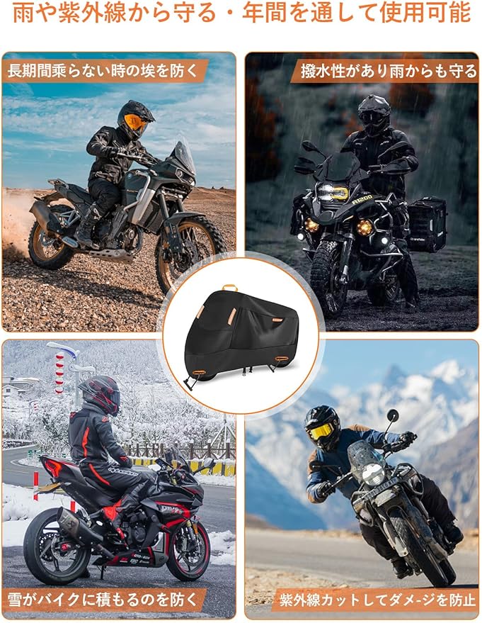 【盗難防止&風飛び対策】カバー前輪はロック用の盗難防止穴を採用します。大口径ロック用ホールを採用して、鍵を通せば盗難防止にできます。バイクカバーの底は、伸縮性のある裾、調節可能なバックルを采用したデザインで、愛車をしっかりと包み込み、風の侵入を防ぎバタつきを抑え、雨、雪、ゴミ、砂埃などからの悪天候から大切な愛車を保護します。