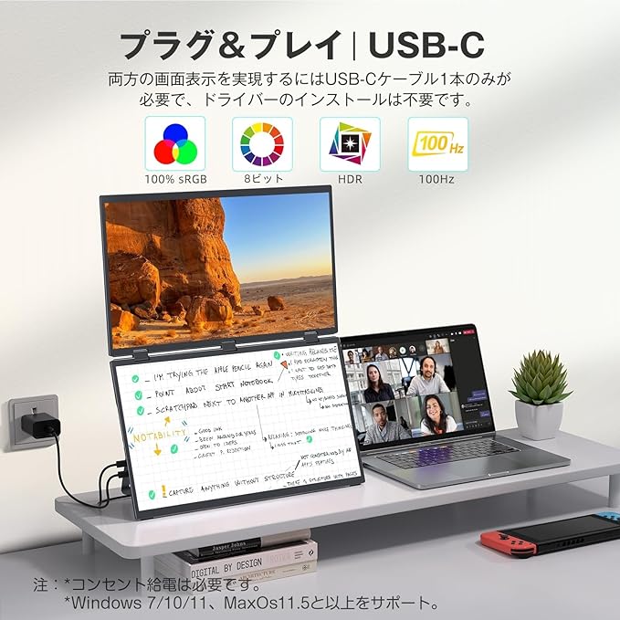 【プラグアンドプレイ・多様な用途】 トリプルディスプレイの接続端末には汎用性の高いみにMiniHDMI・USB Type-Cの2種類を搭載します。Mini HDMIによりPC、タブレット、PS4など多いパソコン、ゲーミングデバイスに自由に接続、Type-Cによりスマホ、Macなどの携帯デバイスにも簡単に使用。2つの異なるデバイスを同時に接続できるため、複数のユーザーの好みを同時に満たすのに最適です。デュアルモニターのインターフェイスが豊富なので、新しいデバイスなら問題なく対応でき、時間のコストを節約、作業効率をトリブルに!また、デュアルモニターと接続にType-Cケーブルを一本で信号と電源が伝送されることで、変換ケーブルを介さずに設置の時間とエネルギーのコストを節約するのは魅力です(Type-Cケーブル一本で接続に、デバイス端末はType-C3.1又はThunderbolt3/4のフル機能のポートを搭載すること必要;また、Type-Cケーブル一本で接続に、PD45W電源をご使用ください)。