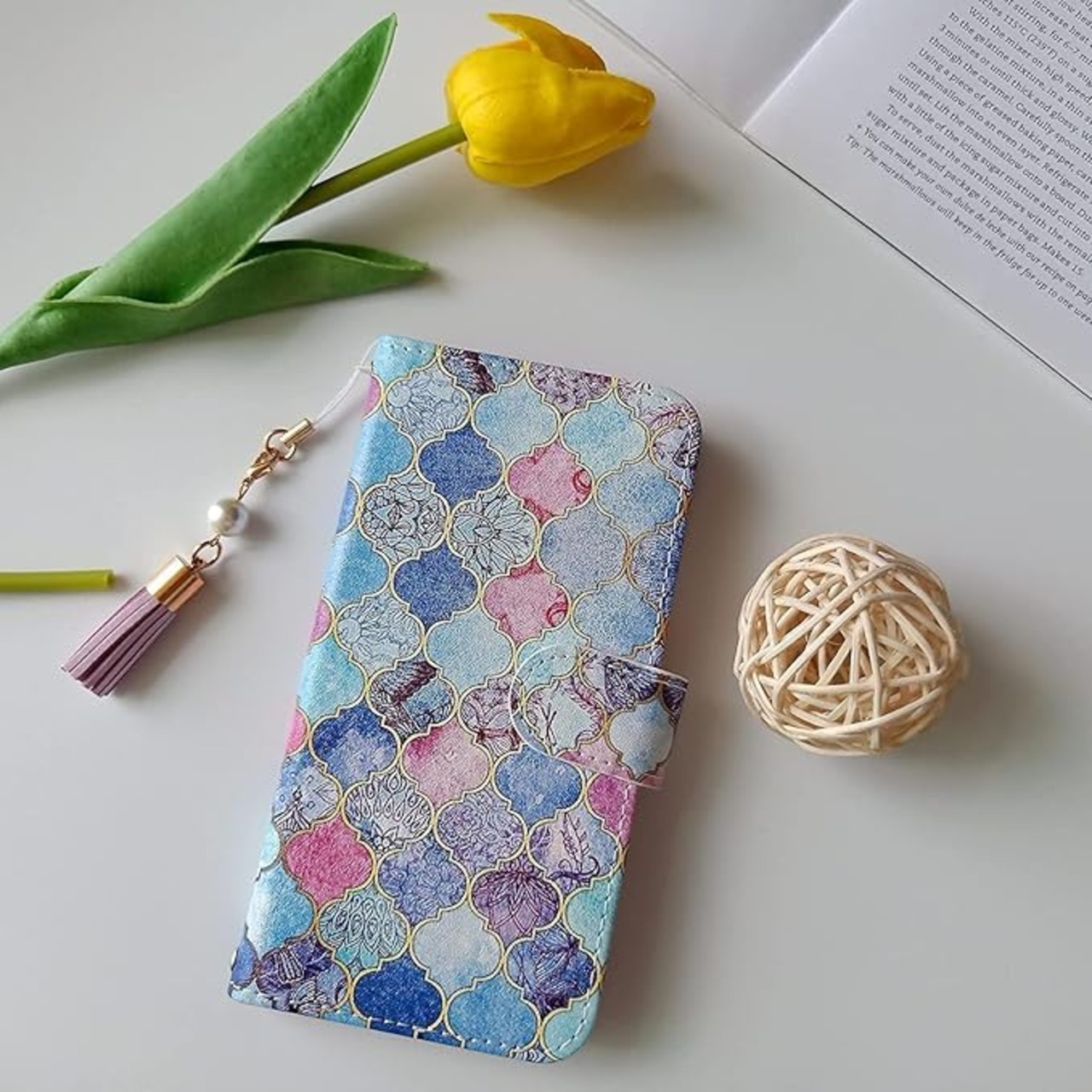 らくらくスマートフォン F-53E ケース 手帳型 docomo F-53E チャーム な タッセル ストラップ付き カード かわいい TPU スタンド 機能 F-53E スマホケース(らくらくスマートフォン F-53E,青鳥)