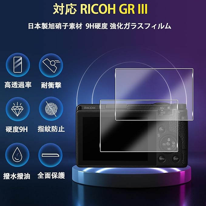【対応機種 簡単に貼り付け】 対応 RICOH GR III/GR IIIX フィルム ガラスフィルム 専用に設計されています。素材に日本製の旭硝子を採用。 フィルム自体のシリコン自己吸着層により、位置を合わせて上から軽く置くだけで気泡が入ることなく誰でも簡単、綺麗に貼ることができます。
