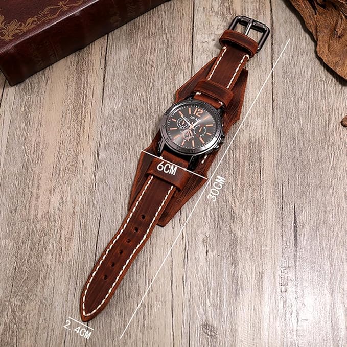 太めのレザーベルトとアンティークデザインが特徴の高級感漂う腕時計です。