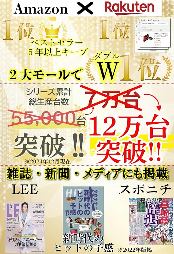 対応デバイス 【縦でも横でも取り付けができるデバイス】 ●Kindle Paperwhite ●Kindle Paperwhite シグニチャー エディション ●Fire HD 8/Fire HD 8 Plus ●Nokia T10 ●Asus Zenpad8.0, 【横向きでのみ取り付けができるデバイス】 ●Fire 7 ●Fire HD 10 ●Asus Zenpad10 ●iPad 4 ●iPad 3 ●iPad 2 ●iPad 1, 【横向きでのみ取り付けができるデバイス(厚さ0.8cm未満)】 ●Fire Max 11 ●Nokia T20 ●Nokia T21 ●Samsung S6LITE ●iPad 10 ●iPad 9 ●iPad 8 ●iPad 7 ●iPad 6 ●iPad 5 ●iPad Air5 ●iPad Air4 ●iPad Air3 ●iPad Air2 ●iPad Air2 ●iPad Air(M2) ●iPad Pro11インチ(M4) ●iPad Pro11インチ(第4世代) ●iPad Pro11インチ(第3世代) ●iPad Pro11インチ(第2世代) ●iPad Pro11インチ(第1世代) ●iPad Pro10.5インチ ●iPad Pro9.7インチ ※厚みが0.8cm未満のタブレットは取り付けの際しっかりと上下から押してロックするようにしてください。, 【縦でも横でも取り付けができるデバイス(厚さ0.8cm未満)】 ●iPad mini 6 ●iPad mini 5 ●iPad mini 4 ●iPad mini 3 ●iPad mini 2 ●iPad mini 1 ※厚みが0.8cm未満のタブレットは取り付けの際しっかりと上下から押してロックするようにしてください。 表示を増やす