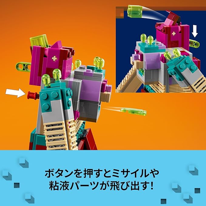 レゴ(R)Minecraft Legends(マインクラフト レジェンズ)シリーズ初のセット、デバウアーとの対決(21257)は、最低最悪の汚い系キャラ(もちろん、お子さまには大人気!)のマインクラフト アクションフィギュア付きで、大興奮のバトルアドベンチャーごっこが楽しめる組み立てセットです。8才以上のゲーム好きのお子さまへのプレゼントにいかがでしょうか。 新登場のマインクラフト レジェンズの世界を舞台に、レゴ マインクラフトのヒーローが、最強のボスキャラのひとりデバウアーと直接対決。かさぶたや傷跡などや胞子に覆われた組み立て式大型フィギュアの長い腕と体は、まさにゲームで見たままの姿です。デバウアーのボタンを押すと、口からミサイルを発射し、背中のバックバックから粘液パーツを飛ばします。セットには、旗・マント・ダイヤモンドの剣・リュートといったゲームそのままのアイテムを携えたマインクラフトのレンジャーヒーローのフィギュアが付属し、デバウアーに戦いを挑みます。大きなくちばしに乗ったレンジャーは、スケルトンや丸石ゴーレムといった仲間を率いて登場します。また、3D表示でモデルを拡大・回転してチェックでき、組み立ての進捗を保存できるLEGO(R) Builderアプリ対応も、ゲーム好きのお子さまに人気のポイントです。