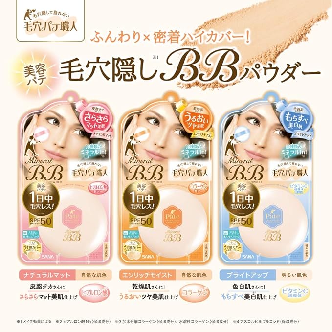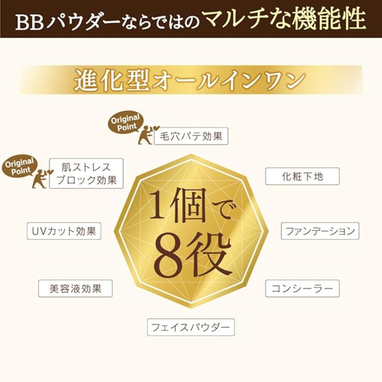 ひと塗りでふんわり毛穴レスな肌に! 1日中崩れない、1個で8役のBBパウダー。乾燥が気になる方へのエンリッチモイストタイプ。SPF50+ PA++++。自然な肌色。
