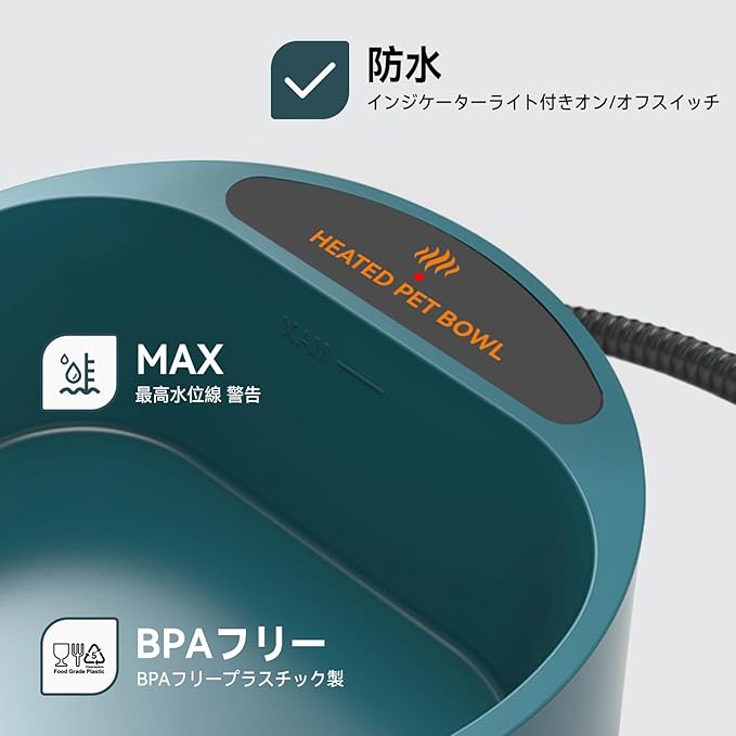 安全な材料:BPA材料を使い、加熱する時有害物質が発生することはない。防水スイッチや噛まれることを防止するコード、より安全に利用する。