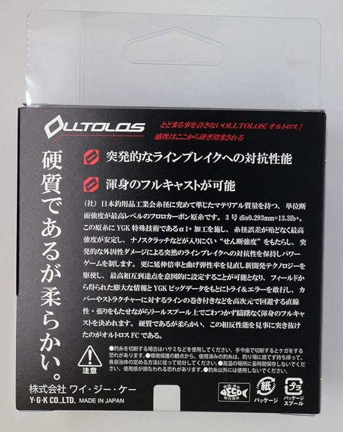 とどまる事を許さないOLLTOLOS「オルトロス」感性はここから研ぎ澄まされる (社)日本釣用品工業会糸径に究めて準じたマテリアル質量を持つ、単位断面強度が最高レベルのフロロカーボン原糸です。3号dia 0.293mm=13.3lb 。この原糸にYGK特殊技術であるα1+加工を施し、糸径誤差が殆どなく最強強度が安定し、ナノスクラッチなどが入りにくい【せん断強度】をもたらし、突発的な外因性ダメージによる突然のラインブレイクへの対抗性を保持しパワーゲームを制します。更に延伸倍率と曲げ弾性率を見直し新開発テクノロジーを駆使し、最高相互到達点を意図的に設定することが可能となり、フィールドから得られた膨大な情報とYGKビックデータをもとにトライ&エラーを敢行し、カバーやストラクチャーに対するラインの巻き付きなどを高次元で回避する直線性・張りをもたせながらリールスプール上でごわつかず躊躇なく渾身のフルキャストを決めれます。硬質であるが柔らかい、この相反性能を見事に突き抜けたのがオルトロスFCである。