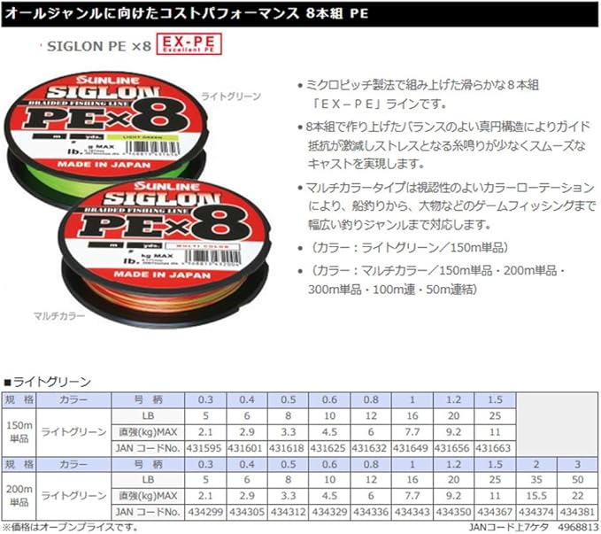シグロンPE 8 (ライトグリーン)! ! オールジャンルに向けたコストパフォーマンス8本組PE! ! ●ミクロピッチ製法で組み上げた滑らかな8本組「EX-PE」ラインです。●8本組で作り上げたバランスのよい真円構造によりガイド抵抗が激減しストレスとなる糸鳴りが少なくスムーズなキャストを実現します。