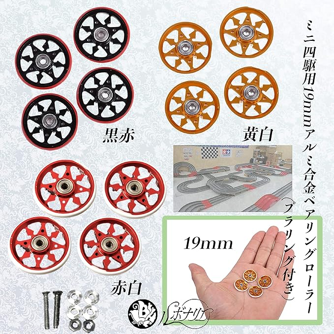 高速コーナーに強い!プラリング付きミニ四駆用19mmアルミ合金ベアリングローラー4個セットです。