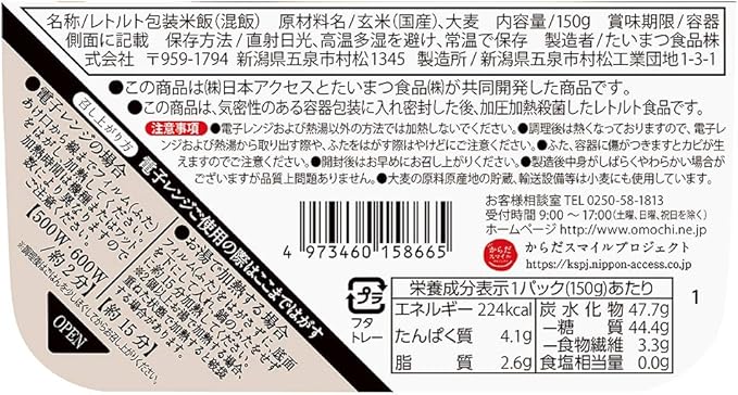 ぷちぷちとした大麦と玄米の食感が楽しめる、健やかにおいしい玄米とスーパー大麦ごはんです。1パック玄米は「金のいぶき」使用。「金のいぶき」は通常の玄米と比較して胚芽の大きさが約3倍の玄米です。(国産玄米使用) 家族の食卓にも、お一人での食事にも。一食分でも、一品だけでも。いつもの食事にささっと「からだスマイルプロジェクト」をプラスして、手軽に栄養バランスを整え、健康的で美味しい食生活を楽しめます。